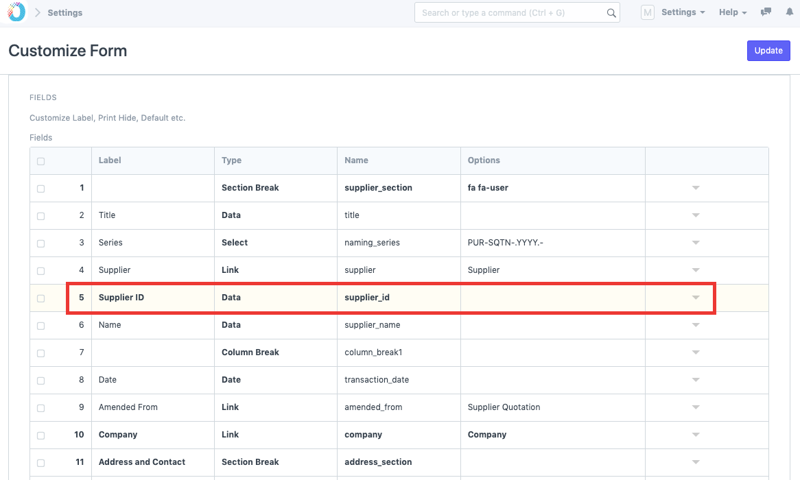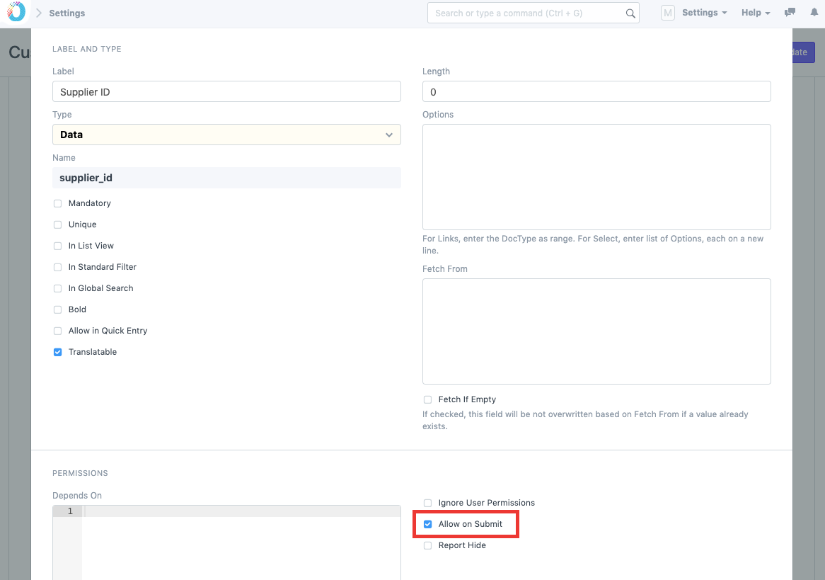 In TechoERP, once a document is submitted, you can only edit it through Cancel > Amend. However, you can still make certain fields (custom fields) editable after submission using the Allow on Submit feature. For example, we have created a custom field called "Supplier ID" in Supplier Quotation. To allow editing of this field after submission, follow the following steps:
